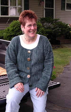 Lisa's greenish-grayish-teal Sonnet [below] knit at 6 sts/inch: