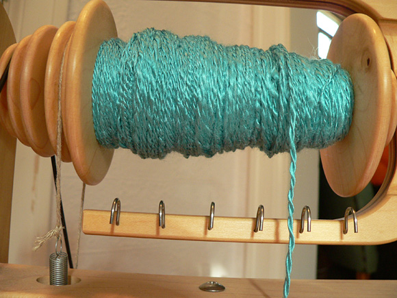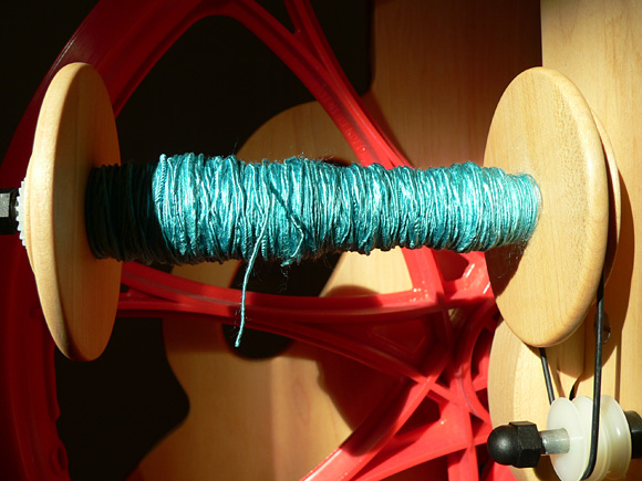As when spindling silk, I choose the lightest spindle I can for bamboo. I have to be much more attentive to the space between my left hand and the spindle hook, and am much more prone to roving coming apart before the twist has a chance to get into it. Spindling bamboo is a lot more like what I thought all non-wool spindling would be for me, but it's still achievable. Still, since I spin to enjoy myself, I will likely keep bamboo for my wheel spinning and stick with tussah on the spindle for the time being.