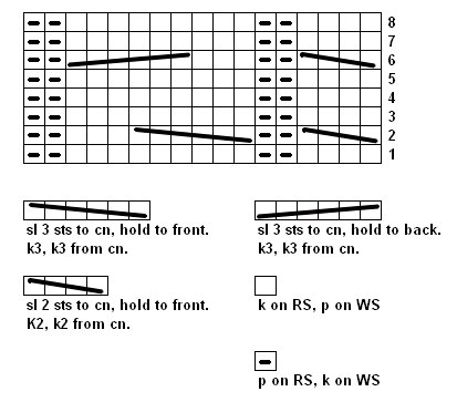 as follows: [k4, p2, k2, k2tog, k1, k2tog, k2, p2]