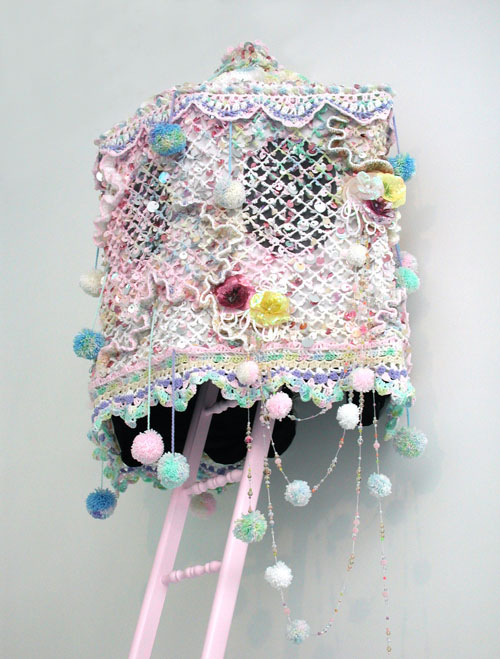 From a crocheted, pastel, sequined hunting blind